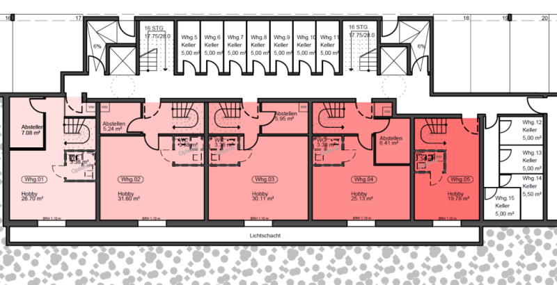 Das Erdgeschoss ist in fünf 3- bzw. 4-Zimmer-Maisonette-Wohnungen aufgeteilt. Jede Wohnung besitzt eine Südterrasse, einen Gartenanteil und einen Hobbyraum im Untergeschoss.