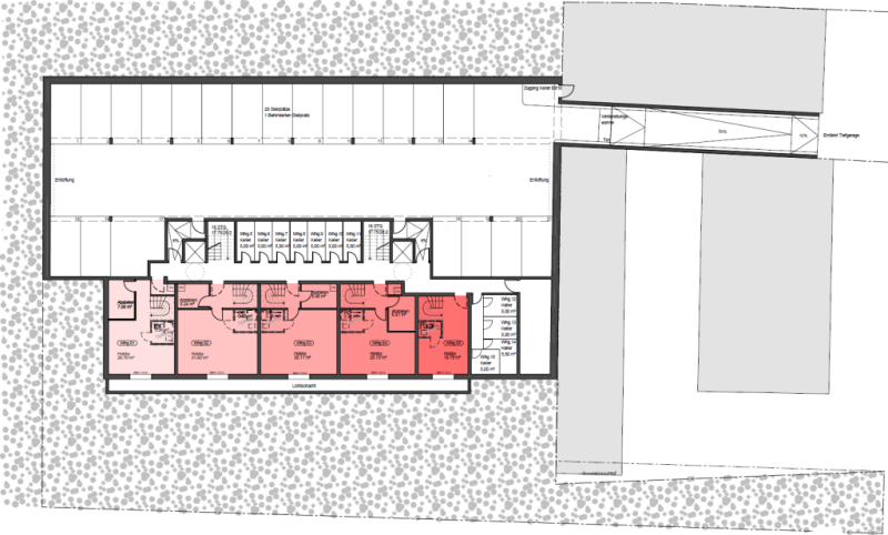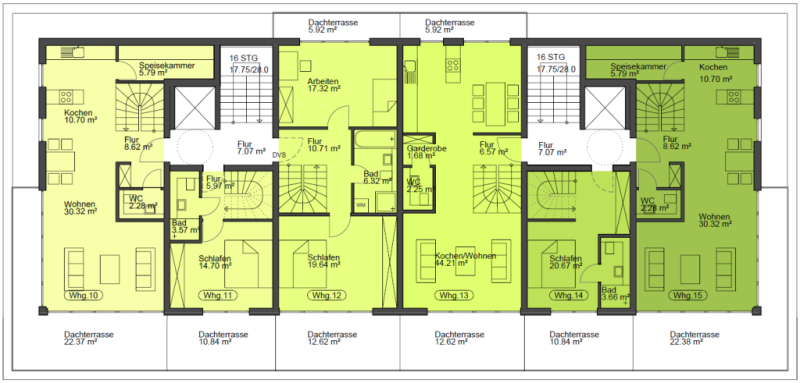 Vier der Wohnungen erhielten je einen Dachgarten zur alleinigen Nutzung. Dieser ist über eine wohnungsinterne Treppe über einen eigenem Dachausstieg zu erreichen.