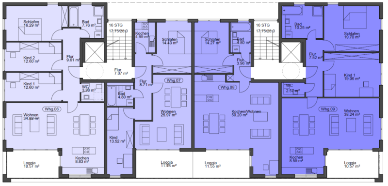 Im ersten Obergeschoss befinden sich vier barrierefreie 3- bzw. 4-Zimmer-Wohnungen mit Südloggia. Die Aufteilung war sehr variabel und ist auf individuelle Kundenwünsche angepasst worden.